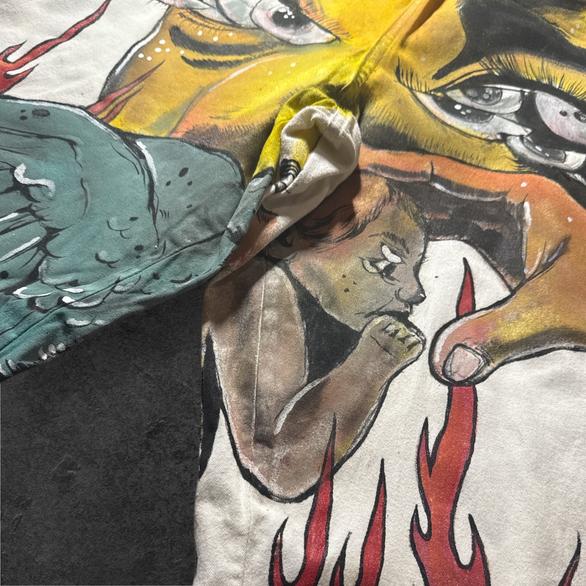 A wearable canvas built around transformation. These custom shorts feature the bold “REBORN” hit across the front, surrounded by hand-painted figures and flame details—raw, emotional, and loud in the best way. Flip them around and the back becomes the statement piece: a surreal face with layered eyes, a reaching hand, wing imagery, and flames—symbolizing protection, rebirth, and stepping out of what tried to burn you.