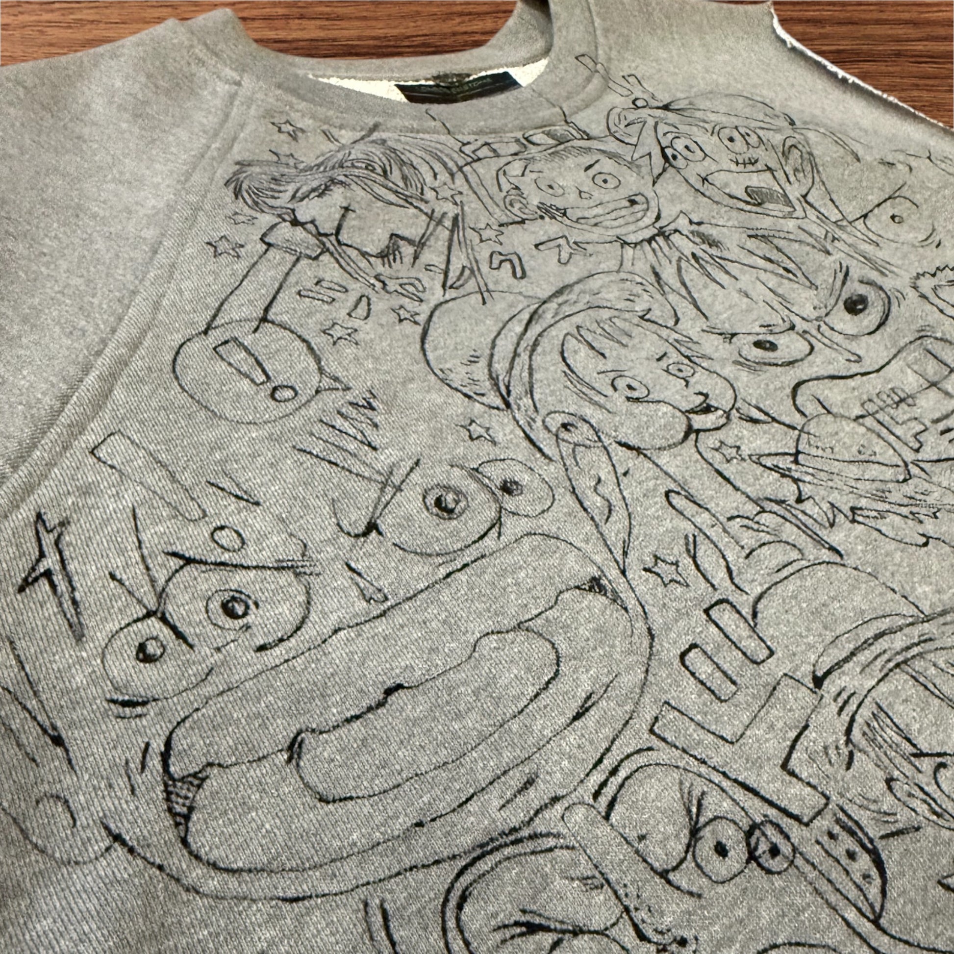 A grey cropped crewneck hand-designed with a full front collage of Naruto characters in raw pencil-style illustration.