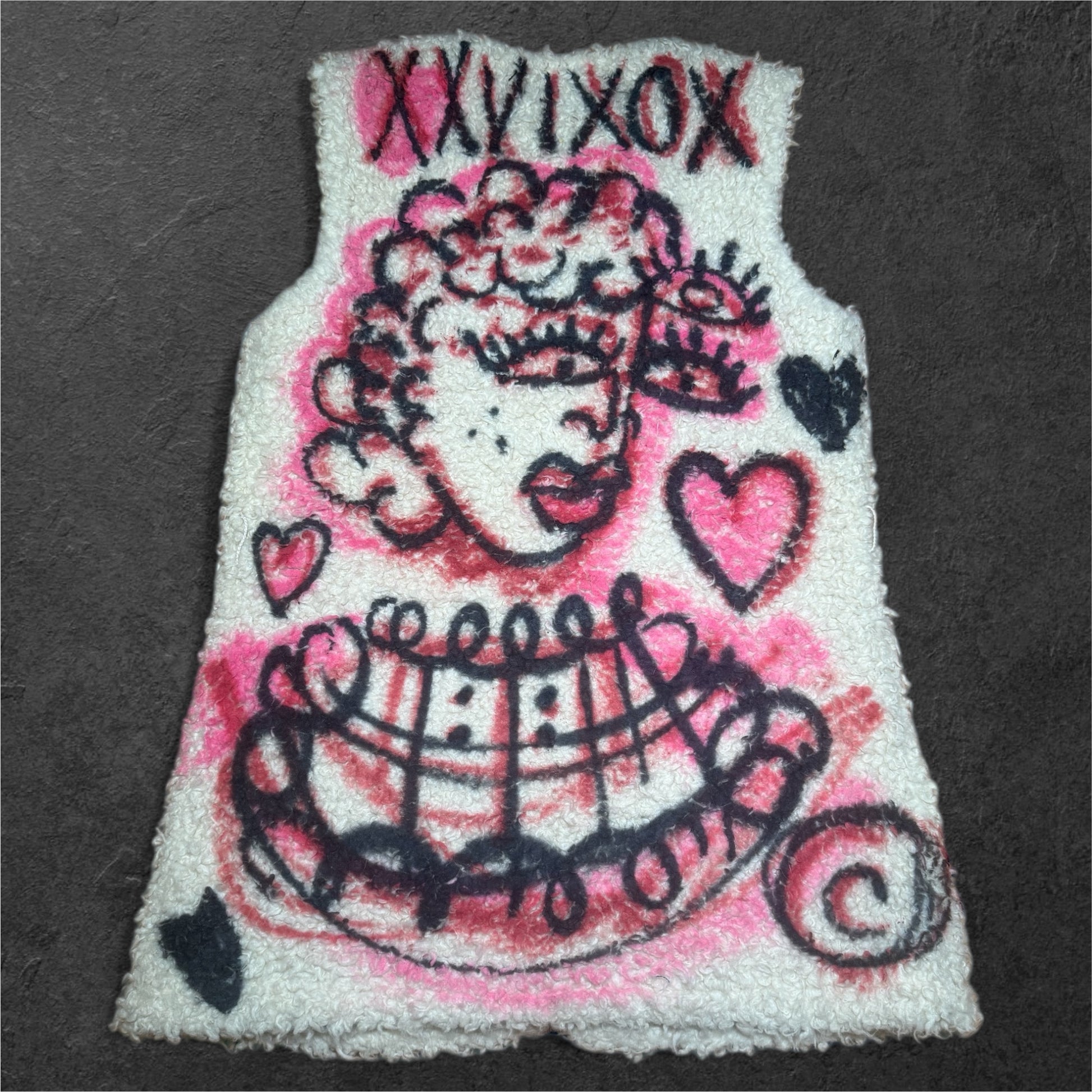 Turn your outfit into a statement with this custom hand-painted sherpa vest, crafted on premium textured teddy fleece and transformed into wearable art. Every stroke, heart, swirl, and portrait is painted completely by hand using fabric-safe paints — no prints, no transfers, no duplicates.